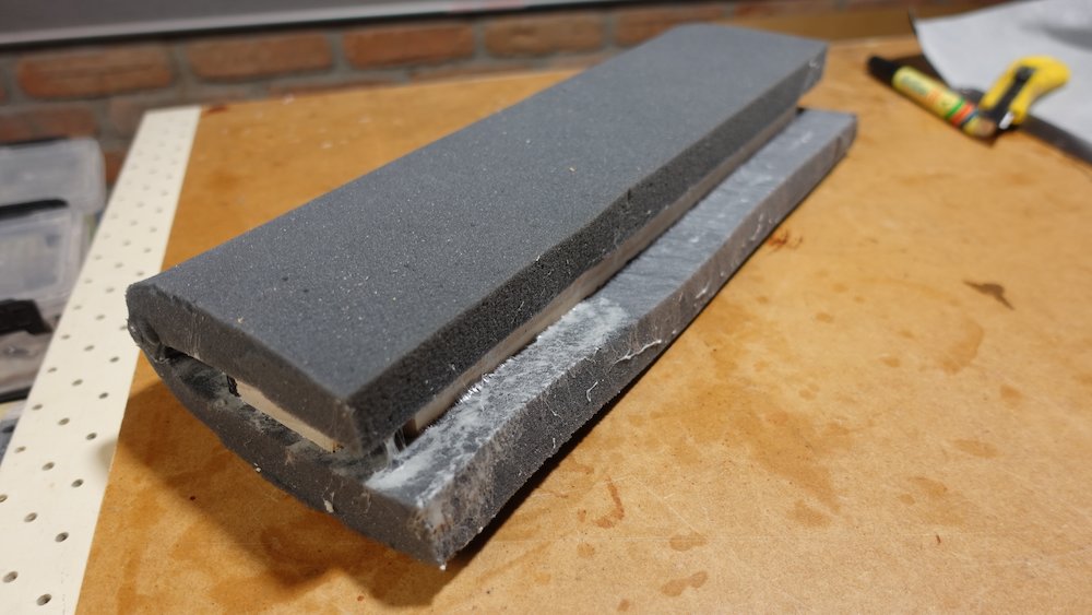 harder foam, about 280x380, to wrap around the heel-barrier timber, edges flush with base